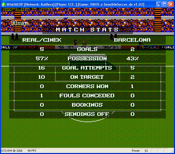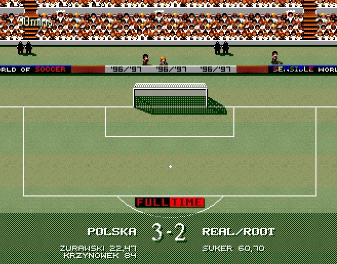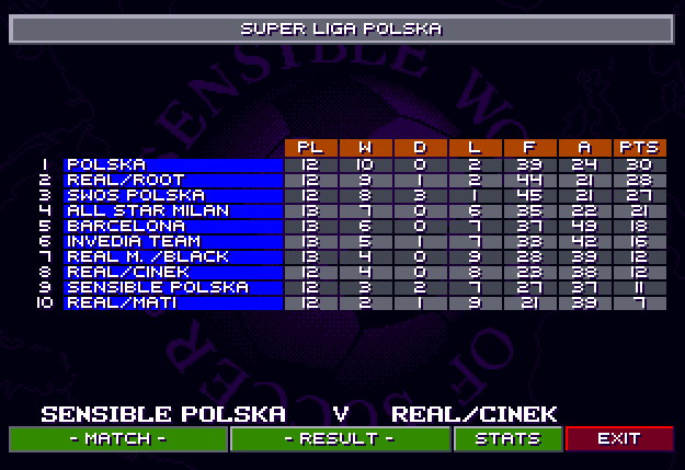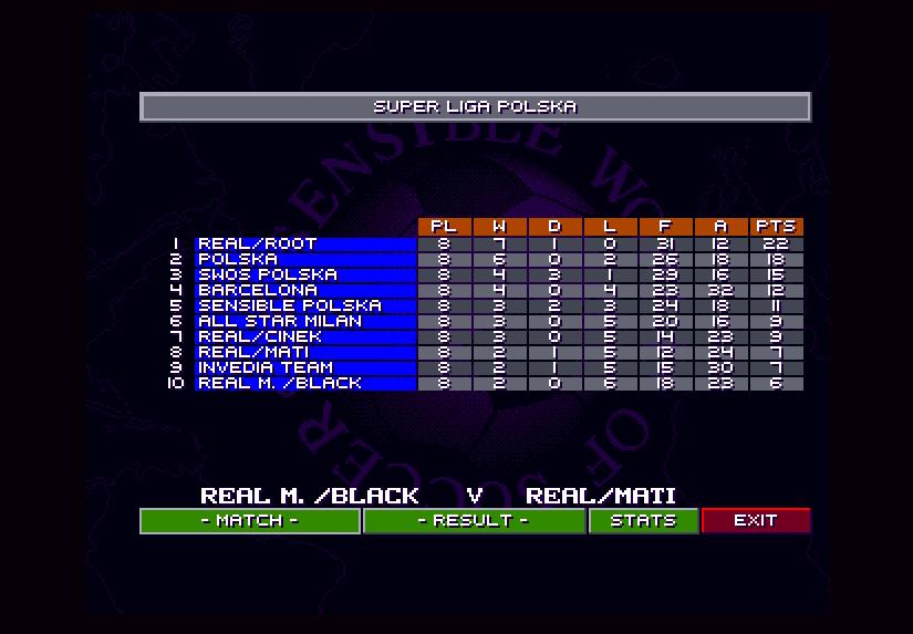 Mecz środka tabeli, obie drużyny przystąpiły do spotkania w pełnych składach. Gra rozpoczęła się bardzo szybko, akcja środkiem i Van Basten strzela z przysłowiowego skosa i w 6 minucie jest 1-0 dla Pabla. Zaledwie 5 minut później akcję skrzydłem wykańcza Dior lobując bramkarza Milanu i jest 1-1. 16 i 45 minuta to pokaz prostej piłki przez Milan i pokaz słabej obrony przez Sensible Polska. Identyczne akcje co w 6 minucie zakańcza dwukrotnie Van Basten i do przerwy jest 3-1 dla drużyny Pabla. W przerwie obrona Spankina dostała ostro po uszach i w drugiej połowie żaden skos nie wpadł już do jego bramki. Nadzieję na wywiezienie punktów z z gorącego terenu przedłużył Foka w 67 minucie strzelając głÃ³wką po dośrodkowaniu z rzutu rożnego. Niestety atak Spankina grał bardzo niefrasobliwie i nie był w stanie strzelić więcej goli. W 83 minucie Weah z czystej pozycji po podaniu z boku ustalił wynik na 4-2 dla gwiazd Milanu. Mecz nie był zbyt czysty co zakończyło się dwoma żÃ³łtymi kartkami dla graczy Milanu. Na szczęście żaden zawodnik nie odniósł kontuzji.