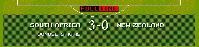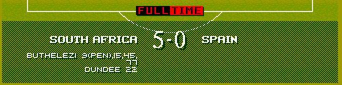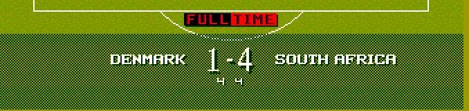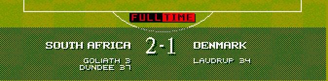 denmark went 2 up with 2 laudrup efforts south africa fought back with the mighty dundee making it 2-1 just before half time denmark scored again making it 3-1 the second half saw south africa bombarding the danish goal and finally dundee tucked 1 away. In the 85th minute denmark gave away a needless penalty which makua tucked away with class.