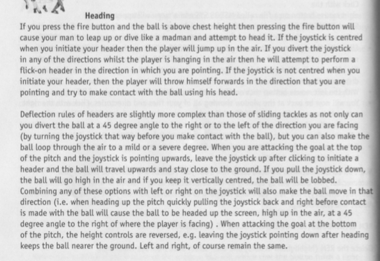 So you've clarified that the distance between player and ball is not a factor, and now I'm clear that I did understand the rest of this part of the manual correctly. (I wish they had put some diagrams in the manual showing joystick/button sequences, it would really have helped - a bit too late to contact the Sensible guys now though...