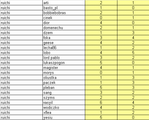 Przypominam, że jeśli chociaż jeden gracz z danej drużyny nie rozegra swoich gier , to obaj zostaną ukarani zakazem gier w następnych organizowanych cupach. Tak więc proponuje się zmobilizować. Rozegrane mecze nie będą miały większego wpływu na końcową tabele poza pojedynkiem Diora z Sangiem. Dior może awansować swój zespół na pozycje 5tą kosztem Grupy Trzymającej Władze. Bez względu na wszystko z turniejem żegnają się Sang i Vasyil czyli zespół Świętej Wojny.