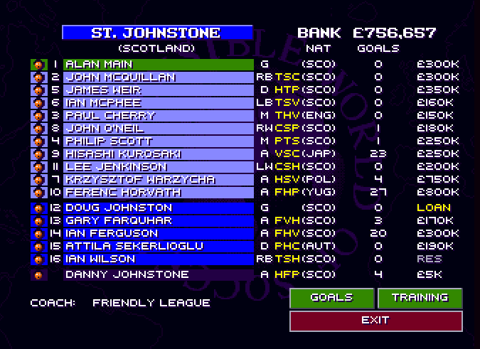 Transferwise we bought 2 new players. Striker Krzysztof Warzycha from Panathinaikos (800k), strong shot and good speed, useless when it comes to dribbling. We also got (lu)Cifer, left wing running like hell, bargain at 450k.