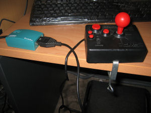 , with an attached clamp for super stability and a rockfire gameport-to-usb adaptor. In fact I have two of those for playing with friends.