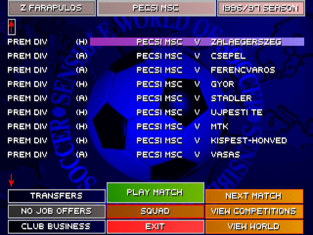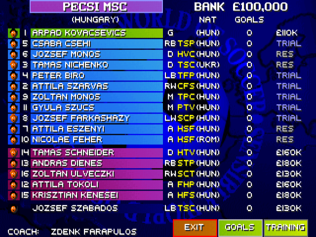 Az első meccs nem sikerült jól. Sajnos a kapus először bekapott egy távolról pattogó lövést, amelyet 13 éve kor fölött már nem szokás, majd még egy védhetőt. A csatárok közül is peches a dolog, mert az eladni szánt Fehér (ROM) a tehetségesebb. Farkasházy, az LW, csak szőke loboncával szerezhet magának hÃveket, mert ennyire rossz játékost még nem irányÃtottam. Nem tudott elrúgni a kapuig. Folytatás rögtön a Csepel elleni kiesési rangadó. Nagy a kisértés, hogy A TökKenő pároshoz nyúljak, de első a tehetségek felfedezése, még ha tehetségtelenek is.