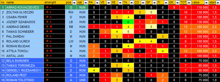 Jó alap, főleg Tökölitől várok sokat, a 0-7-es skálán 4-es a F-fel (igaz mellé 1-es V, 1-es S, 0-ás C). Hátul Szabados lehet a nagy erősség (T=6, S=2), de mellete Schneider (T=5, H=4), Fehér (T=4, H=3), Toronicza (T=4, H=3) is erős védőjátékos, kár, hogy mindegyik tetűlassú.