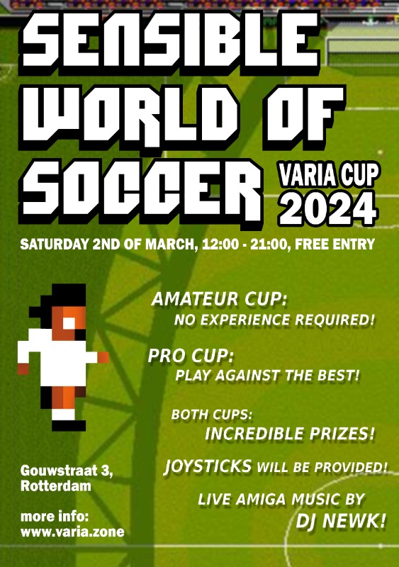 Come and play some classic footie with us at VARIA - be sure to come in time (between 12:00 and 13:00). Or join us for a beer during the afternoon and enjoy some Amiga-tunes provided to you by local legend DJ Newk! If you want to practice beforehand, you can download the game through below links. For more info on the event, write to This email address is being protected from spambots. You need JavaScript enabled to view it.