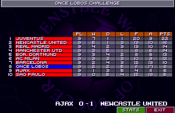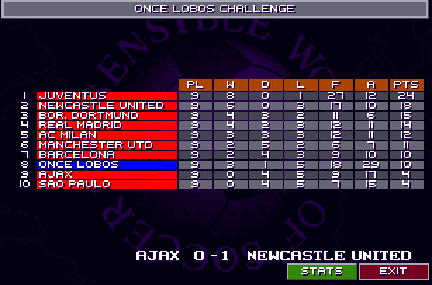 CPU TEAMS: Barca, Real, Milan, Juve, Ajax, Sao Paolo, Newcastle, ManU (change shirts to blue!), Dortmund
