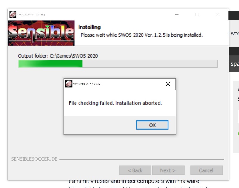 Hi, I just downloaded SWOS 2020 and the installation fails continuously.Here is the message I get every time right after choosing the commentators language: ''File checking failed. Installation aborted''Anyone has come up with this issue? Please help x