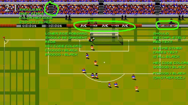 (1) In 'View Highlights' using the Menu, some grey colors and red colors are converted to black. This does NOT happen when pressing the H button at the at of the match to view highlights of a match that has ended. So there is either a problem when the highlights are saved after the match, or when they are loaded for viewing using the menu. See the image attatched (since the Insert option in the editor fails to work on this forum). One of the reds converted to black is also a primary color in the SWOS adboard, the hex code for that red color = fc0000 .